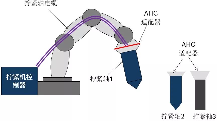 在一些需要切换车型或者工艺的拧紧场合,要机械人能够自动快速更换拧紧轴,这就需要拧紧机具有一个控制器能对应几种不同类型枪体功能,拧紧轴电缆具备拔插功能,且切换时间要短。