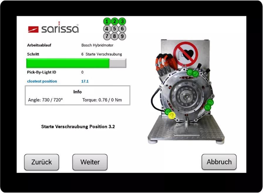 工位上的显示屏可以引导操作人员按照正确的操作顺序,依次对螺栓进行拧紧操作。屏幕上能显示整个装配流程的状态和最终结果,确保整个安装过程中工艺的零缺陷。