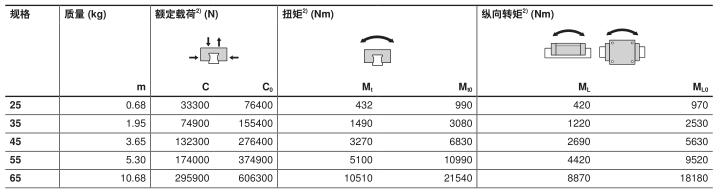 2) 额定动载荷和动转矩是按照 DIN ISO 14728-1 以 100 000 m 行程为基准确定的。实际中经常是以 50 000m 行程为基准。比较:根据表格数值 C、M t 和