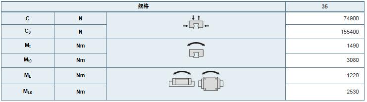 根据 DIN ISO 14728-1 标准,动态额定载荷和载荷力矩是基于 100000 米行程确定的。实际上,通常规定只有 50000 米。对比如下:将表中的值 C,Mt,和 ML 乘以 1.23.